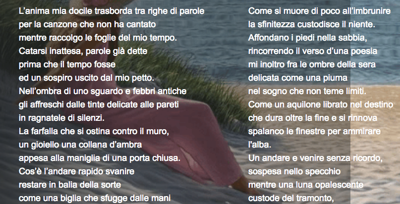 Ringrazio in particolar modo Anna Montella, per l'impegno sempre costante nella sua opera di divulgazione e di sostegno dei nuovi poeti, per la realizzazione di ottimi concorsi e la pubblicazione di antologie e creazione di video-poesie.